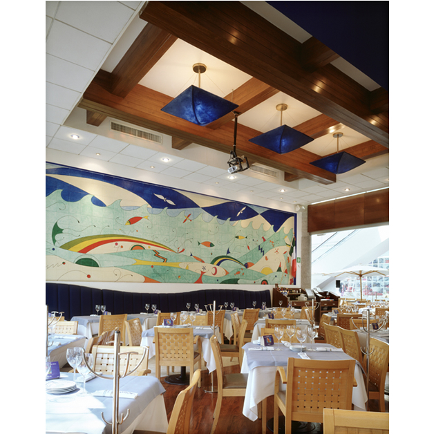 El mural que adorna las paredes es un reflejo de la vajilla, al estilo del arte de Miro, donde se degustan las delicias del mar, lo que hace que los clientes sientan que están comiendo en y dentro del océano, dentro de sus propios platos, lo que hace de su tiempo ahí, una aventura inigualable.